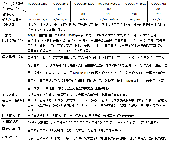 简化各系统之间繁杂的接口配合工作联络问题,接口具备:VGA/DVI/HDMI/CVBS/IP输入接口;DVI、HDMI输出接口;支持网络视频的解码显示,支持标准RTSP协议传输方式,支持H.264及H.265编码格式解码,兼容海康 、大华、宇视、汉邦、英泰智、英飞拓、波利、翔飞、三星、索尼、科达、安讯士、博世、富尼泰达、美电贝尔等主流摄像机厂家设备支持系统的整体升级,模块化插卡式设计,输入卡、输出卡、切换卡、控制卡、风扇、电源等全部采用模块化设计,便于日后系统的升级和维护。