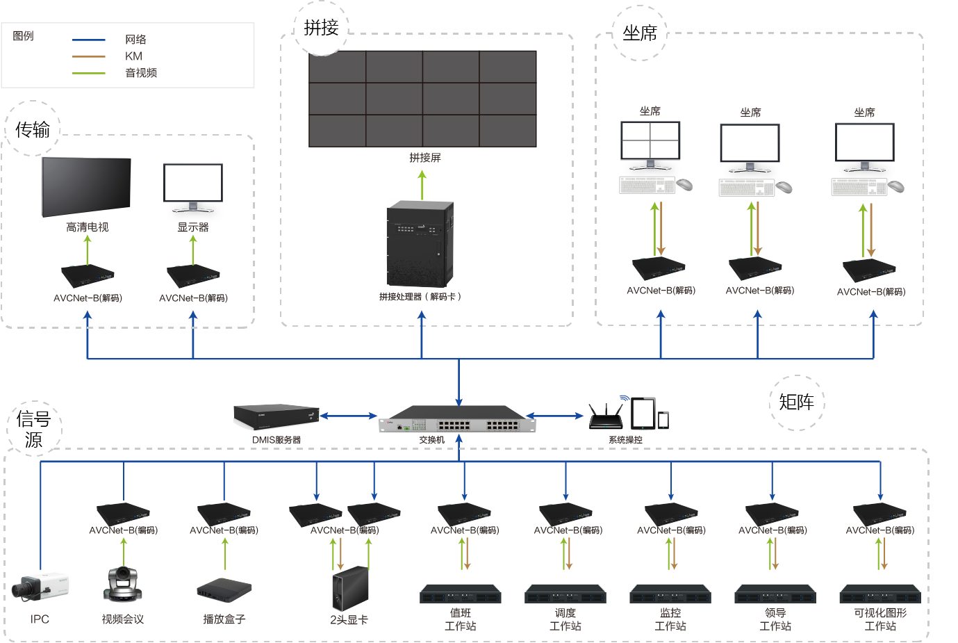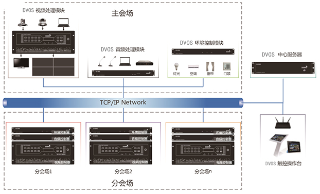 通过TCP/IP网络,DVOS可实现多会场之间的音视频数据共享和交互,并通过用户权限管理实现跨地域跨网络的统一管控;