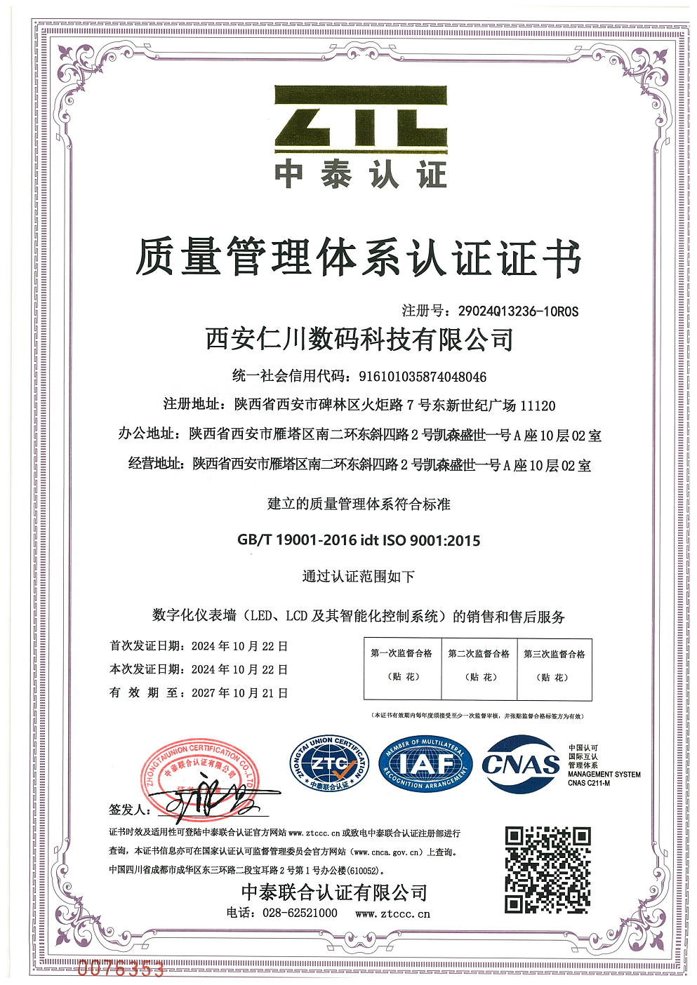 质量管理体系认证证书