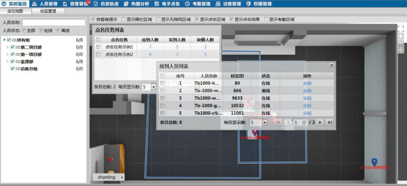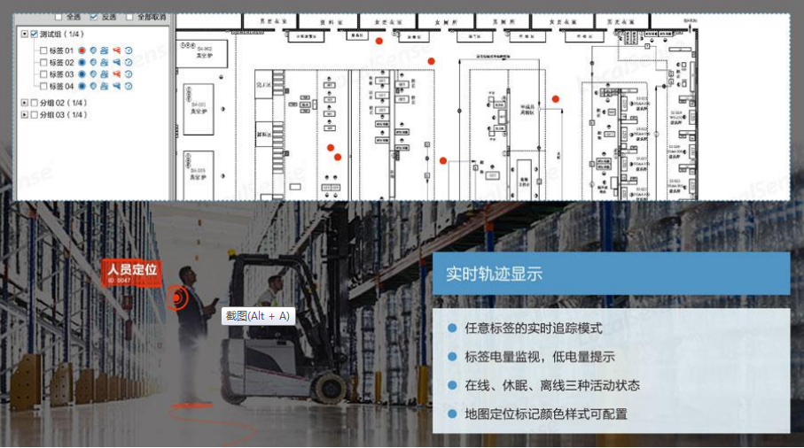 2、突发情况报警:当发生突发情况,员工可通过按下所携带的定位标签上的定位按钮发出警报,同时,电厂监控室的动态显示界面会立即触发报警事件并进行记录。